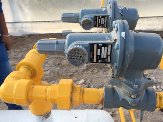 Si en un invernadero están instalados 10 calefactores con una generación de 400,000 btus/hr la demanda total por hora son 4,000,000 btus/hr, la capacidad del regulador debe de ser mayor a la demanda total. Se instalan 2 de la misma capacidad, en un cuadro de regulación con válvulas de cierre y manómetros a la entrada y salida, por si falla un regulador no afecte la operación. Así mismo se selecciona de acuerdo al diámetro de salida y rango de presión a regular.